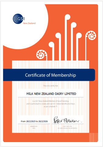 Milk New Zealand Dairy Limited is a member of GS1 and has it's own licensed Bar Code numbers available for all its products