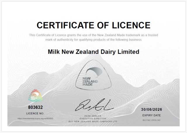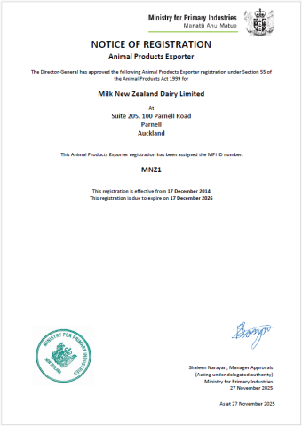 Milk New Zealand Dairy Limited is registered with the Ministry of Primary Industries and is licensed to export dairy products worldwide.