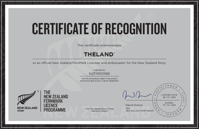 Milk New Zealand Dairy Limited is proud to be licensed to use the NZ Fernmark on its THELAND products.